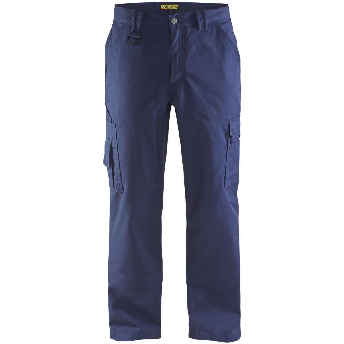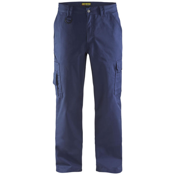 Work trousers with plastic zip fasteners in the flies and wide belt loops back and at the sides.