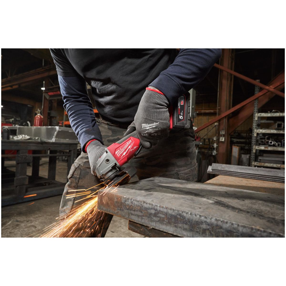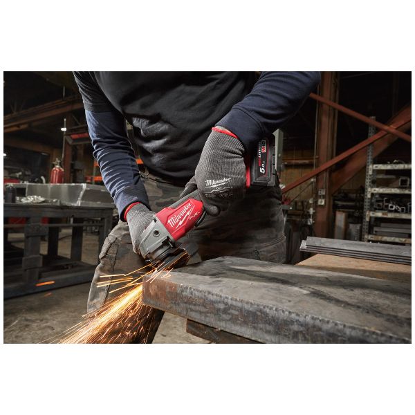 Delivering corded performance similar to a 12 W grinder Reduced gearhead size and lower angle of battery slot - for better balance & ergonomics compared to previous model Anti-vibration side handle for lower vibration Integrated FIXTEC™ system for tool-free wheel change Slim handle design Removable dust screen to prevent debris entrance, prolonging motor life 125 mm keyless guard for great cutting capacity and fast guard adjustment without using a key Line-lock-out function to prevent automatic start up The DNA of our FUEL™ platform redefines the balance of cordless technologies. MILWAUKEE®'s POWERSTATE® brushless motor, REDLITHIUM™ battery pack and REDLINK PLUS™ electronic intelligence delivering outstanding power, run time and durability Flexible battery system: works with all MILWAUKEE® M18™ batteries