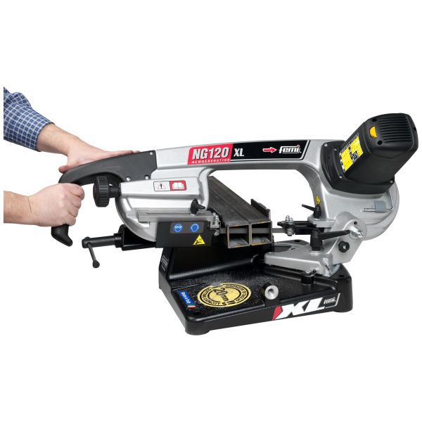 La scie à ruban pour métaux NG 120 XL, dotée du système exclusif NG, réduit le temps de coupe jusqu'à 60 % grâce à la rotation opposée de la bande de scie. Elle offre une vitesse de bande réglable en continu, des guides de bande de scie doubles et une capacité de coupe allant jusqu'à 120 mm, idéale pour des coupes en biseau précises jusqu'à 60°. Fabriquée en Italie.