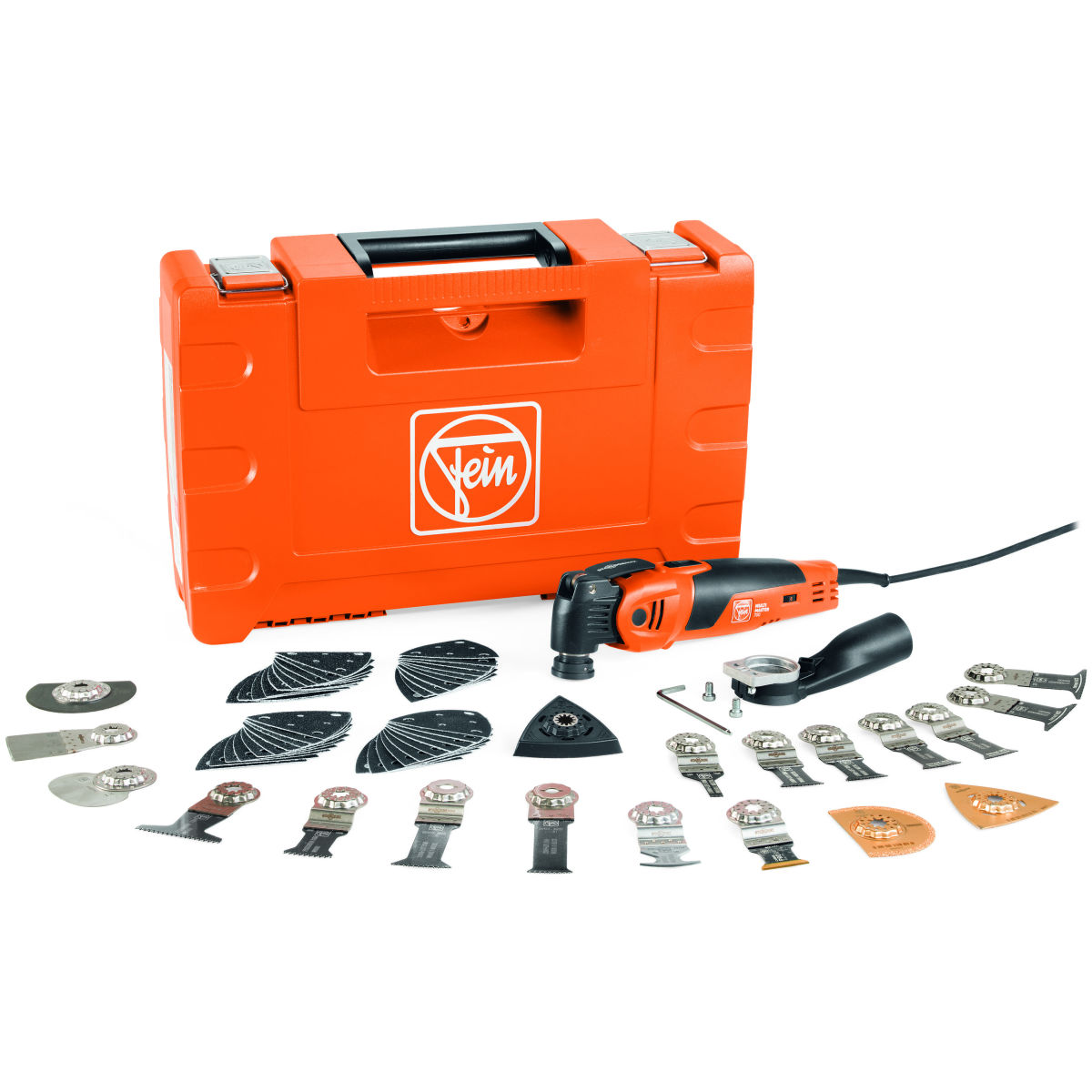 MultiTool FEIN pour une vitesse de travail ultra rapide lors de l’aménagement et de la rénovation avec 60 accessoires – pour scier dans du bois, du métal et des plastiques, pour la dépose du carrelage, pour la découpe des joints en silicone et des moquettes, pour retirer des restes de colle et pour enlever la colle à carreaux.